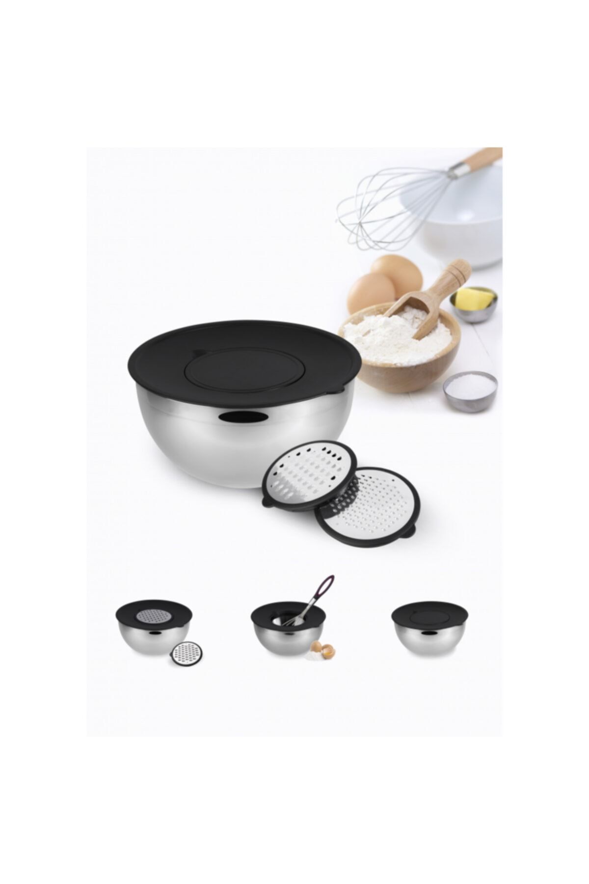Emsan Demre 3in1 Çok Amaçlı Saklama Kabı Siyah;Rendele, Karıştır, Sakla.;Paslanmaz çelikten üretilmiş çok amaçlı karıştırma ve saklama kabı olan Demre 3 in 1, bir ürün ile 3 ayrı özellik sunmaktadır rendeler, karıştırır, saklar.;Etrafında bulunan korunaklı yapı sayesinde kapta çırpma işlemi yapılırken kenarlara sıçratmaz.;2 ayrı rendeleme başlığı sayesinde farklı desen ve biçimlerde rendeleme işlemi yapılabilir.;Kendine ait kapağı sayesinde içerisinde hazırlanan gıda, kap değiştirmeden muhafaza edilebilir.;Mikrodalga fırında kullanılamaz.;Bulaşık makinesinde yıkanabilir.;Ölçü: 3,80 LT;Ürün Çapı: 24 CM;Malzeme: 18/10 CrNi Paslanmaz Çelik