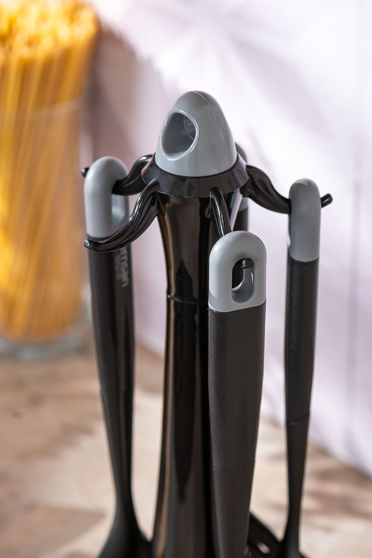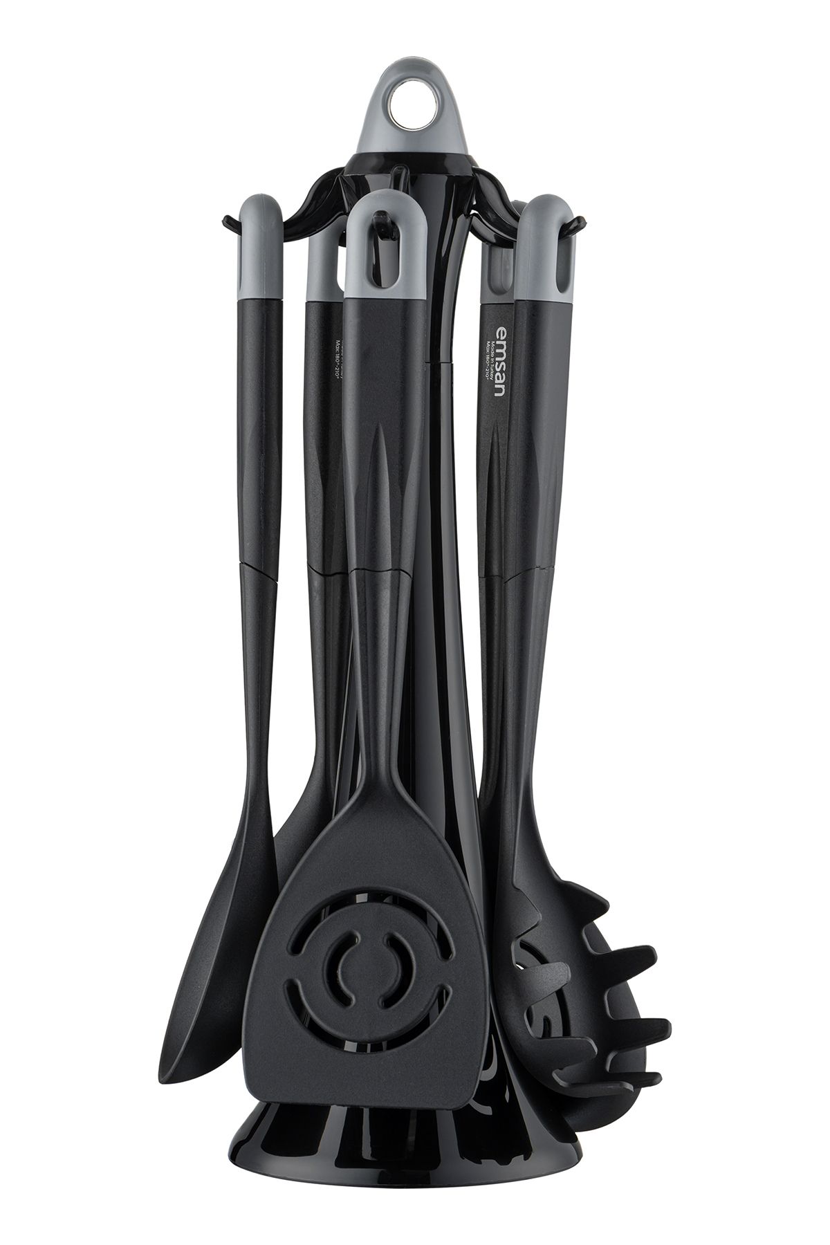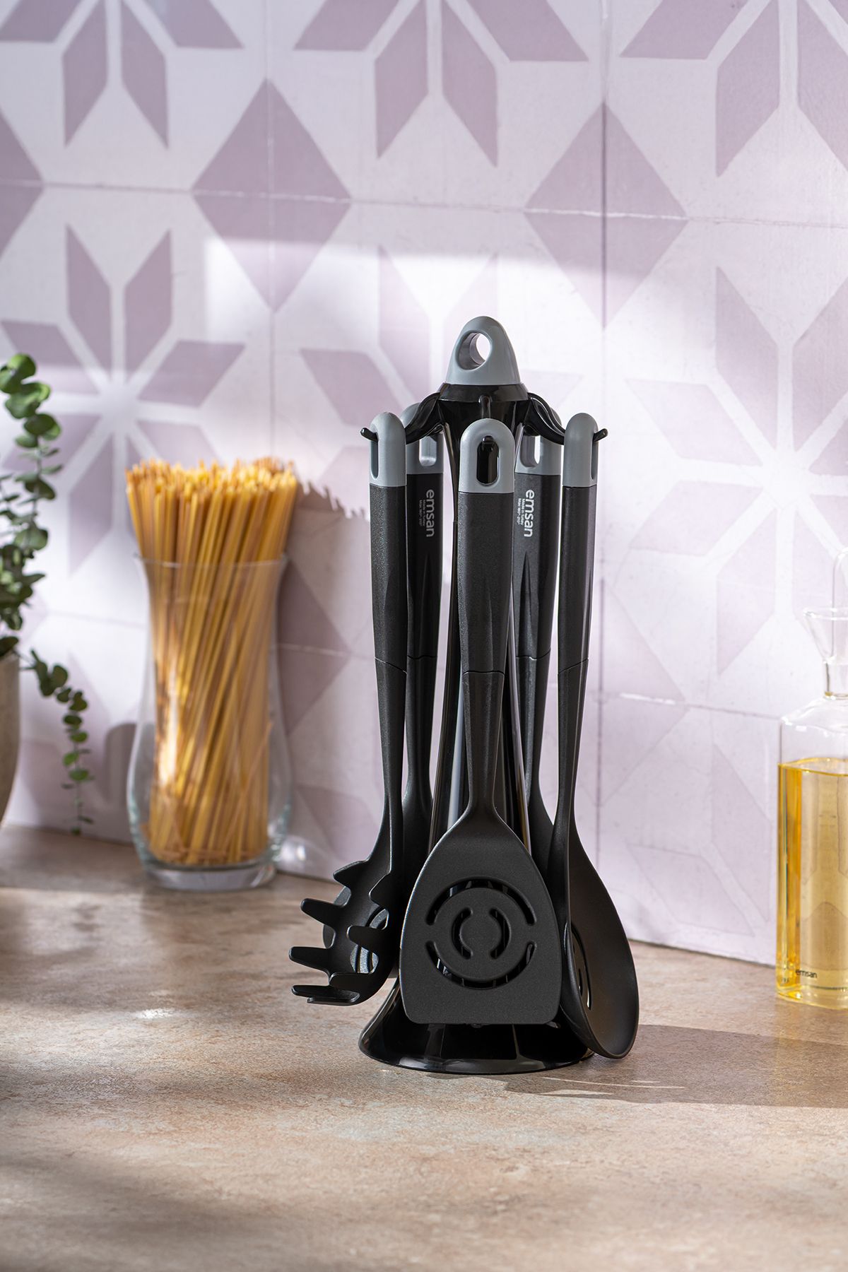 Emsan Hera 6 Parça Standlı Servis Seti Silver Set İçeriği Kevgir (32,5 cm); Kepçe (33 cm); Kaşık (33 cm); Makarna Kaşığı (33 cm); Spatula (32,5 cm); Malzeme: Plastik Özellikler Ürünün elde yıkanması tavsiye edilir.; Yüksek ısıya uzun süre maruz bırakılmadığı sürece ocakta pişen yemeklerde rahatlıkla kullanıma uygundur.; Tencerelerde çizilme gibi sorunlara sebep olmaz.; Günlük kullanıma uygundur.;