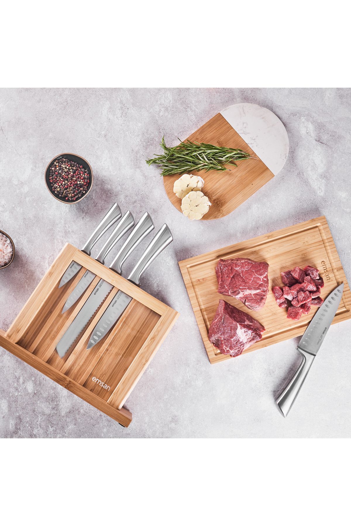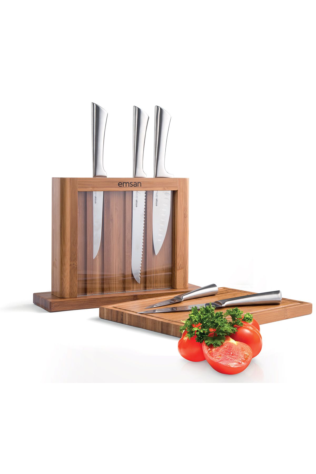 Emsan matriks 7 parça bıçak seti paslanmaz tezgahınızda yer kaplamayan şık tasarımı ve özel bambu malzemeden üretilen ekmek tahtası aparatı ile artık herşey elinizin altında.; bilenmesi gerekmeden uzun süre keskinliğini koruyabilen paslanmaz çelikten şık tasarımlı bıçak setidir.;Kesilen malzemenin bıçak üzerine yapışmasını engelleyen özel kanallar bulunmaktadır.;Bulaşık makinesinde yıkamaya uygundur.; Uzun ömürlü kullanım için yıkandıktan sonra hemen kurulayınız.; set içeriği9 cm soyma bıçağı12,5 cm sıyırma bıçağı15 cm doğrama bıçağı20 cm ekmek bıçağı15 şef bıçağıbambu kesme tahtası