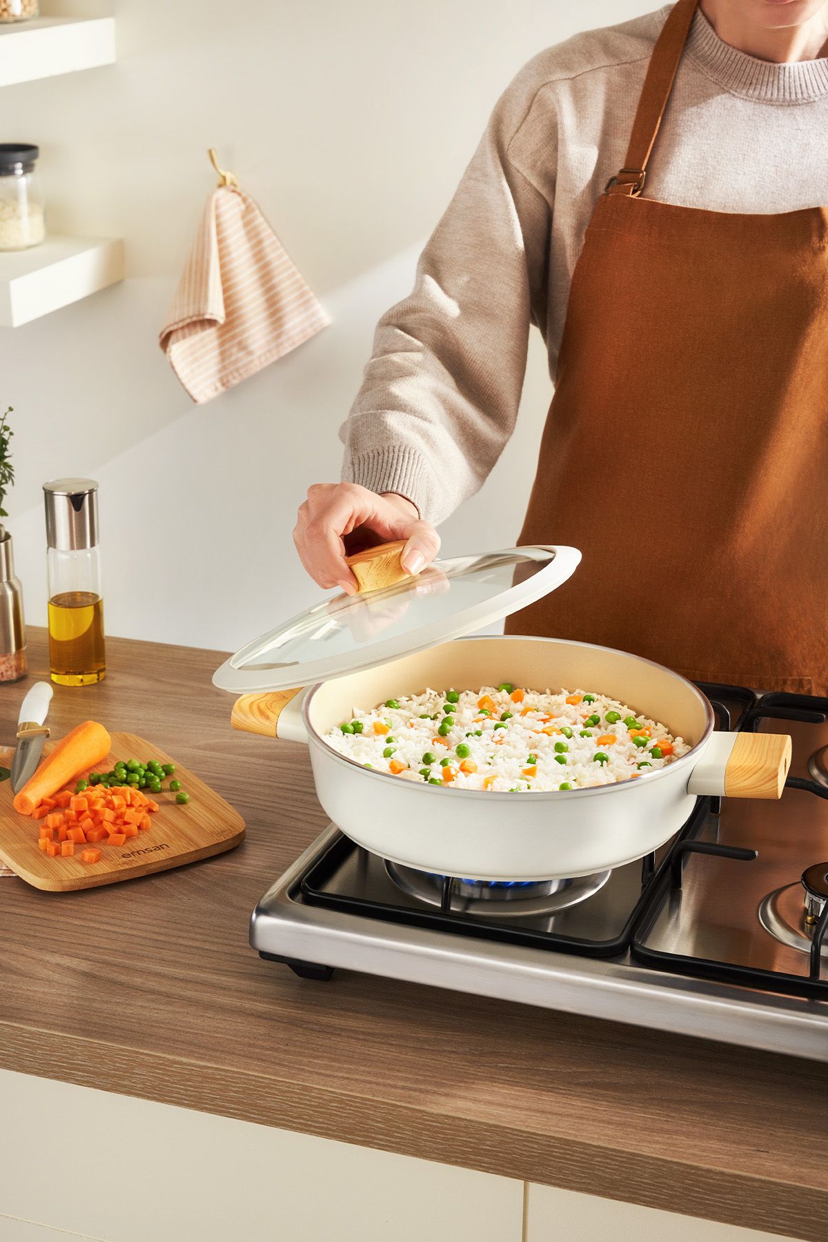 Yüksek kaliteli seramik dış materyal ile üretilmiş, uzun ömürlü ve dayanıklı kullanım sunar; Yapışmaz taban özelliği sayesinde pişirme sırasında yiyeceklerin tencereye yapışmasını önler ve temizliği kolaylaştırır; İç yüzeyi de seramik malzemeden yapılmış olup, ısıyı eşit bir şekilde dağıtarak mükemmel pişirme sonuçları sağlar;